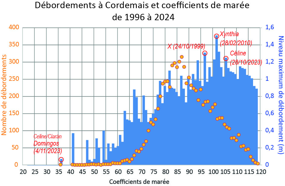 Toutes les pleines mers débordent à partir du coefficient 96 mais les surcotes rendent possibles des débordements lors de coefficients inférieurs, y compris en période de mortes eaux. Ainsi, le plus faible coefficient au cours duquel la pleine mer a débordé est de 36, lors de la succession de tempêtes Céline - Ciaran - Domingos fin octobre / début novembre 2023.