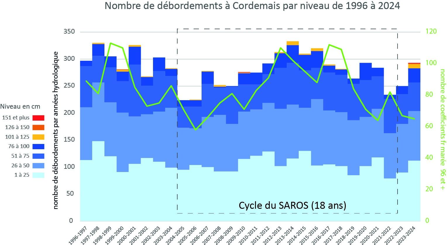 En moyenne par an depuis 1996, 284 pleines mers sur 706 débordent, soit 4 pleines mers sur 10. Sur la période, le nombre et le niveau de débordement sont principalement commandés par les cycles astronomiques, en particulier le cycle du Saros. Au delà de 75cm, les débordements semblent plutôt influencés par les évènements d'origine atmosphérique. Aucune tendance claire ne se dégage sur la période 1996-2024.