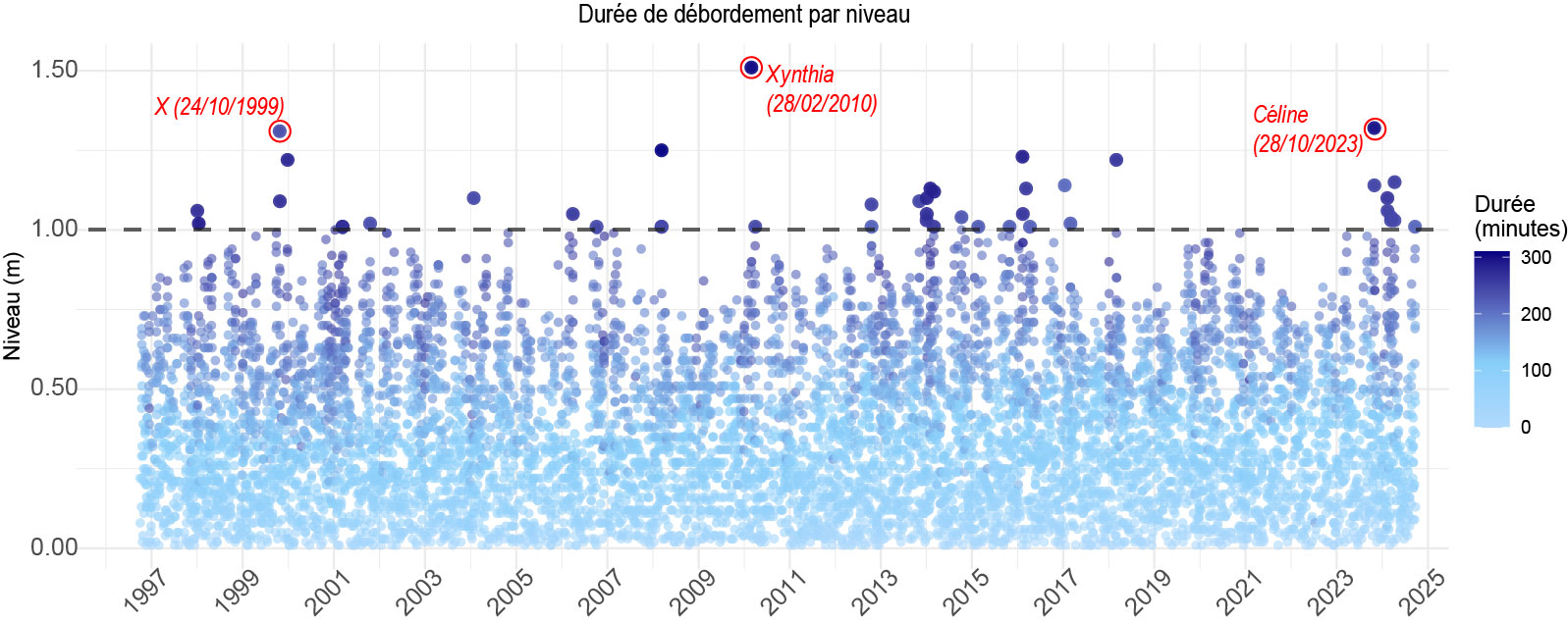 Niveau et durée des débordements entre 1996 et 2024
