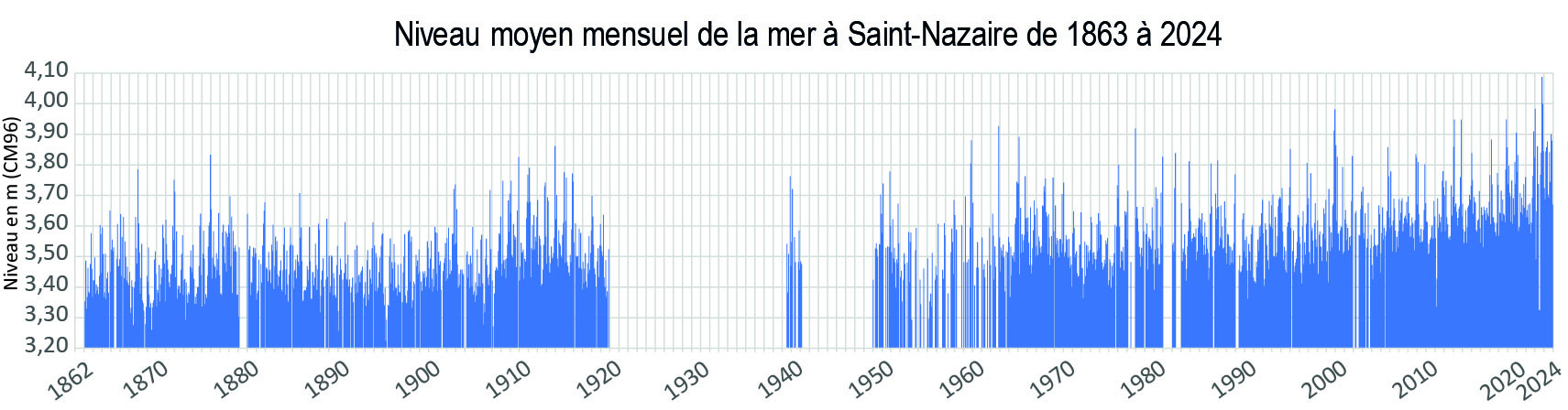 Evolution du niveau moyen mensuel de la mer à Saint-Nazaire depuis 1863